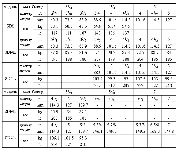 SD-типа бурильных труб диаметром применимо KaVo 21/8-7in (60.3 177.8 мм) и сверлильный станок кава длина контакта зуба делится на короткие (SDS), средний (SDML) и удлиненные (SDXL). SDS для неглубоких скважин, SDML для глубокого, SDXL для глубоких скважин. Технические характеристики в соответствии с API Spec 7K дизайн, производство.